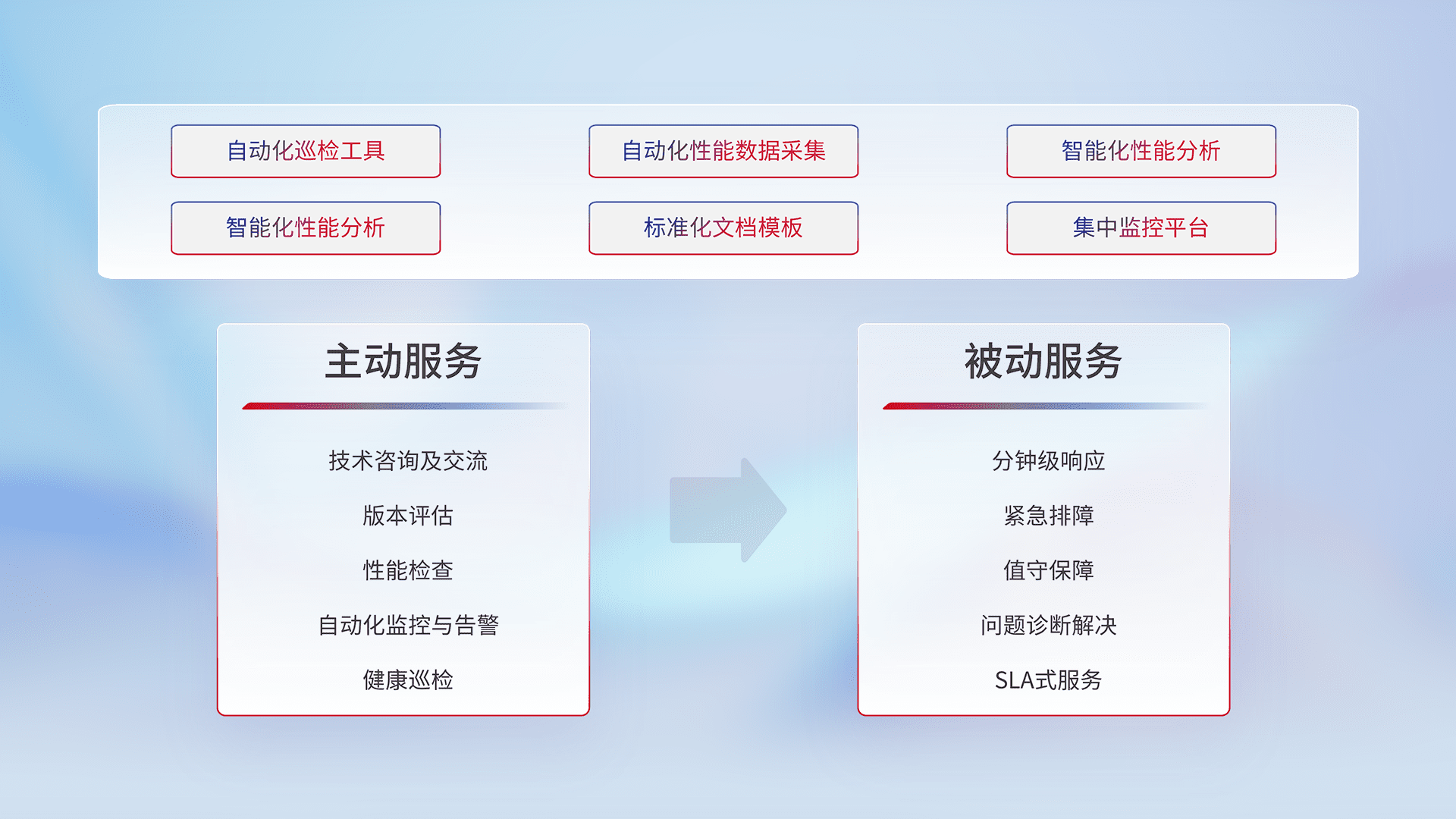 智能化工具和标准化文档,,,,保障服务质量,,,,提供主动服务(包含技术咨询、、、、版本评估、、、性能检查、、自动化监控与告警、、、健康巡检)和被动服务包含(分钟级响应、、紧急排障、、、值守保障、、问题诊断解决、、、、SLA服务)。。。。